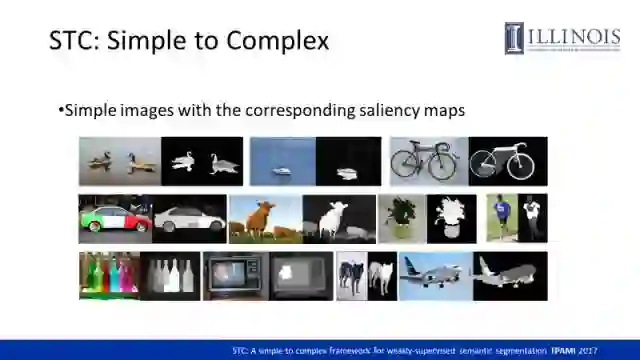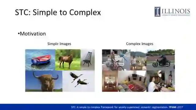 这是我们另一个工作,通过salience map(显著图)来解决弱监督的语义分割问题。这里的motivation是从网络上获取的图片大致可以分为两种情况,一种是simple images,背景干净,只含有单个类别的目标;另一种是complex images,背景嘈杂并含有多类目标。