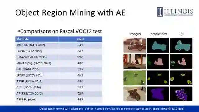 这是我们的方法在Pascal VOC测试集上的测试结果,前面讲到的STC的性能为51.2,之后的ECCV2016的方法将性能提高到了52.7,我们的AE-PSL方法达到了55.7,右图是在校验集上的一些分割结果。