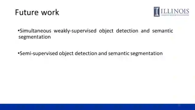 未来会集中于两个方面的研究:1)同时的弱监督物体检测和语义分割,这两个任务可能会相互促进;2) 半监督的物体检测和语义分割。虽然现在的弱监督方法取得了一定的成绩,但是和全监督方法还有一定的差距。我们希望通过结合更多弱监督的标注样本和现有的少量的标注样本通过半监督的方式训练出性能更好的语义分割模型。