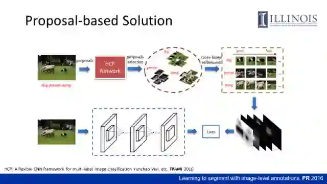 具体方式:先提取proposals,然后通过一个HCP(Hypothesed -CNN-Pooling)网络(后文将详细介绍),判断出proposal的类别信息,筛选出具有高置信度的proposal。进而利用multi-instance learning的思想对这些proposal做re-ranking。我们把图片每一个proposal的特征和其他图片包含这个类别的proposal的特征做距离度量,获取最短距离,然后做累加,统计出哪些proposal与其他标有该类别的图片较近。我们利用排序后的proposal对图片的像素进行投票,从而获取了包含物体位置信息的localization map。最后利用该localization map作为监督信息来训练一个语义分割网络。