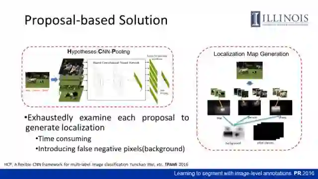 但是proposal-based方法存在很大的缺点。首先,产生proposal的过程本身就很难,从proposal中提取特征又非常耗时。另外,通过累加的方式做定位可能会引入大量的false positive(如背景像素),因此得到的localization map并不是很准。因此当时的性能并不是很好,在Pascal VOC上的语义分割性能在43%(mIoU)左右。