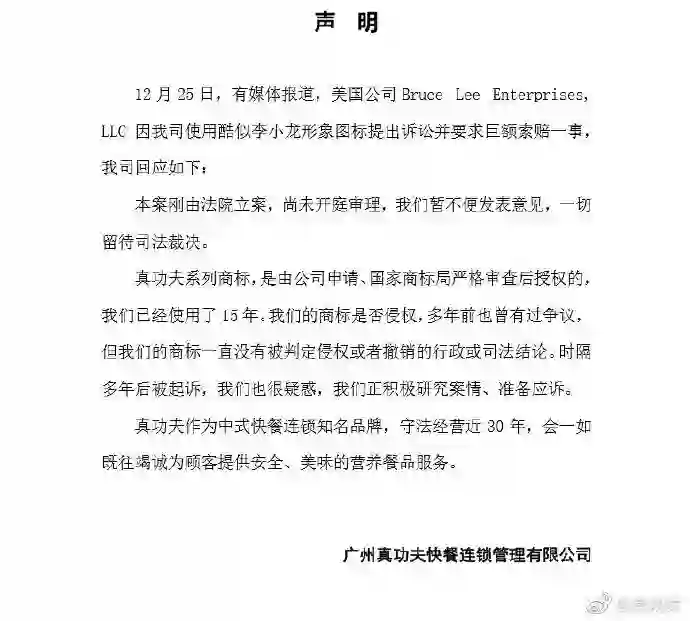 12月25日,据报道,真功夫餐饮因为使用酷似李小龙形象图标用作商标,被李小龙公司诉至上海二中院,索赔经济损失2.1亿元,以及维权合理开支8.8万元。