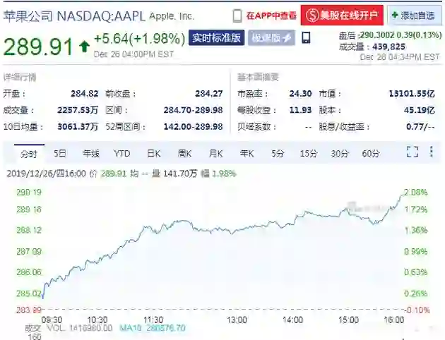 圣诞节后首个交易日,苹果收涨1.98%刷新收盘历史高位逼近290美元,延续了近期连创历史新高走势。