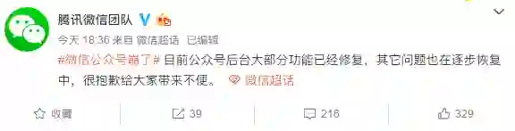 晚上6时左右,微信团队更新进度“目前公众号后台大部分功能已经修复,其它问题也在逐步恢复中,很抱歉给大家带来不便