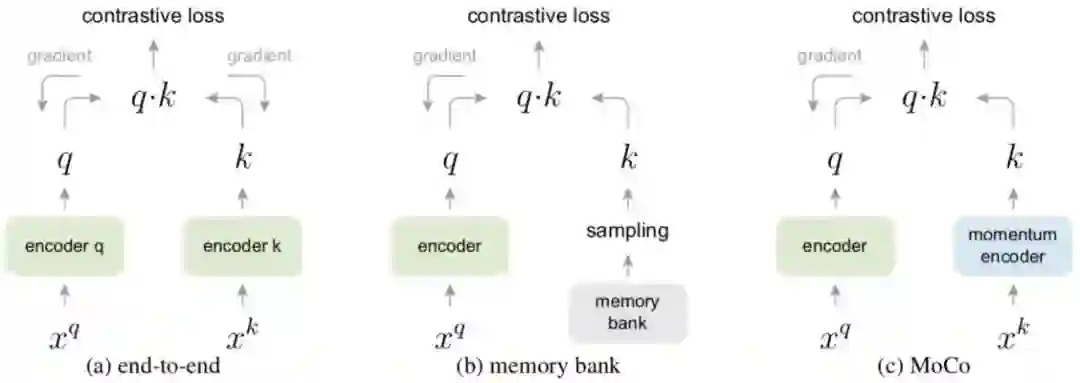 c) 使用queue,每次query之后都删除最早的batch的样本,然后将最新的batch更新入队,这样就巧妙的缓解了memory-bank一致性的问题。同时利用队列可以保存远大于batchsize的样本,这样也解决了end-to-end的batch-size的耦合问题。