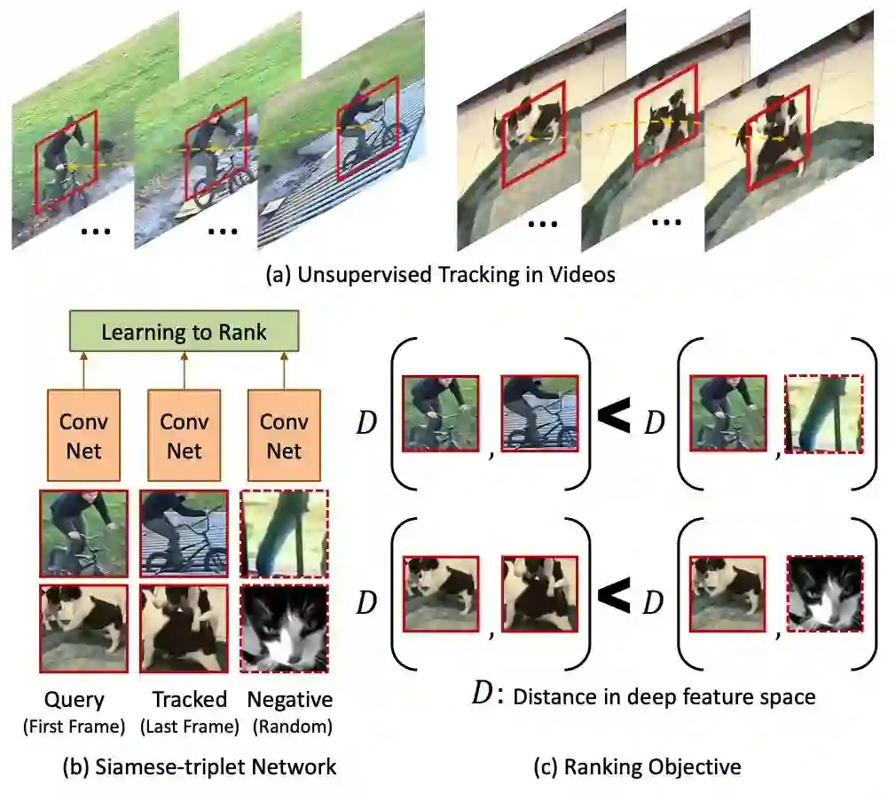基于无监督追踪方法,首先在大量的无标签视频中进行无监督追踪,获取大量的物体追踪框。那么对于一个物体追踪框在不同帧的特征应该是相似的,而对于不同物体的追踪框中的特征应该是不相似的。