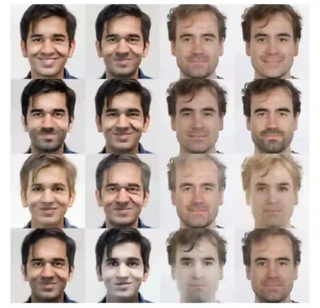 研究人员还可以在任意人脸之间进行插值,使用编码器对两幅图像进行编码,并从中间点进行采样。请注意,输入是任意的人脸,而不是来自模型的样本,从而证明了模型支持整个目标分布。