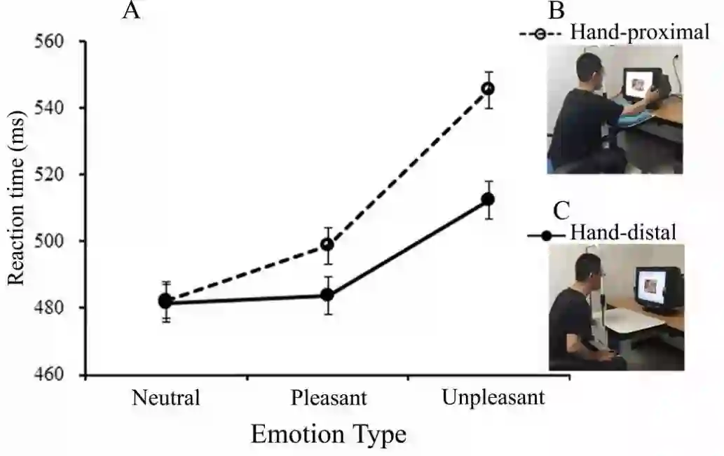 中国科学院心理研究所行为科学重点实验室孙向红研究组研究员杜峰等已有研究发现,视觉认知加工和注意受手与刺激间距离的调节。比如,手近时注意脱离和转换更慢;手近时会诱发更大的西蒙效应(Simon effect);离手近的刺激具有注意的优先性,且能得到更强的认知加工等。这些现象统称为手近效应(hand proximity effect)。但至今没有研究考察过情绪刺激的加工是否受手与刺激间距离的调控。