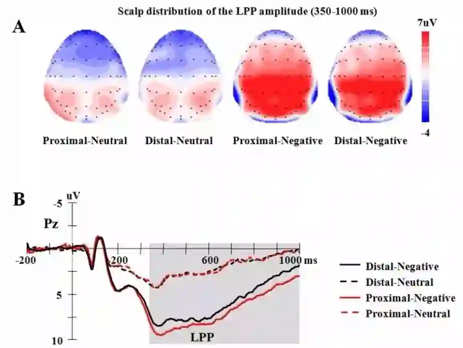 实验3使用 ERP 技术,考察情绪图片诱发的晚期正成分(late positive potential, LPP)是否受手与刺激间距离的调节。实验要求被试认真观看每张图片,但无需做出任何反应。结果发现,手近时负性图片诱发的 LPP 波幅显著大于手远时,而中性图片诱发的 LPP 波幅在手近手远时没有显著差异(图2)。该结果进一步说明手近时只增强了负性刺激的加工。