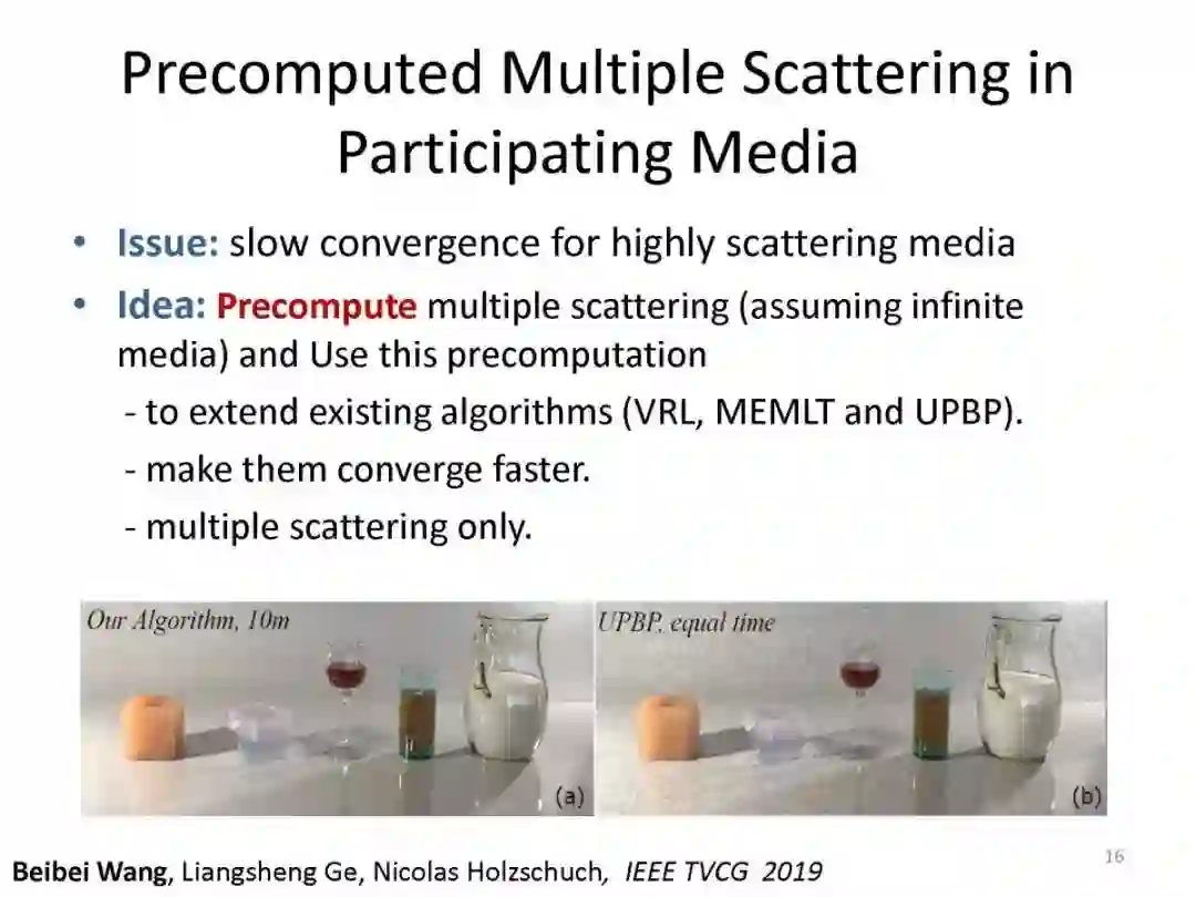 [1] Beibei Wang*, Liangsheng Ge, Nicolas Holzschuch. Precomputed Multiple Scattering for Rapid Light Simulation in Participating Media. IEEE Transactions on Visualization and Computer Graphics, 2019,可在线查看