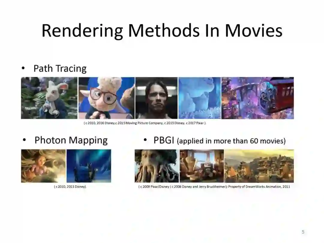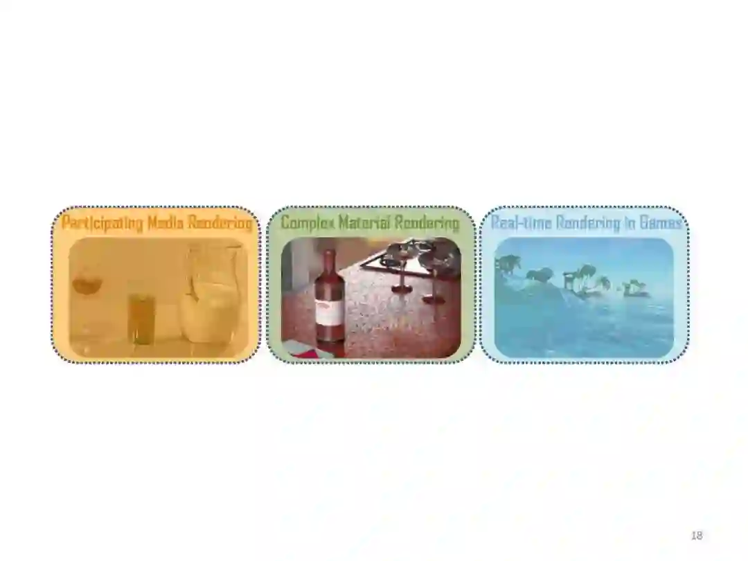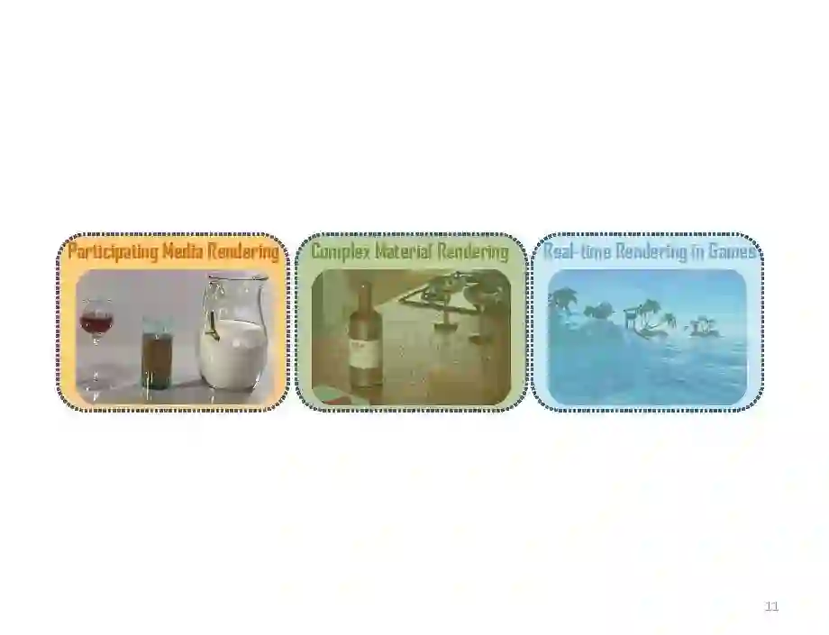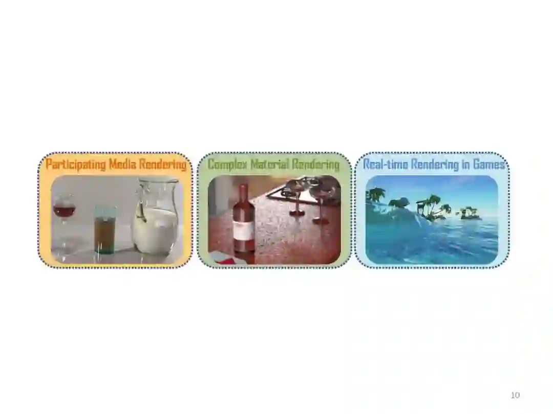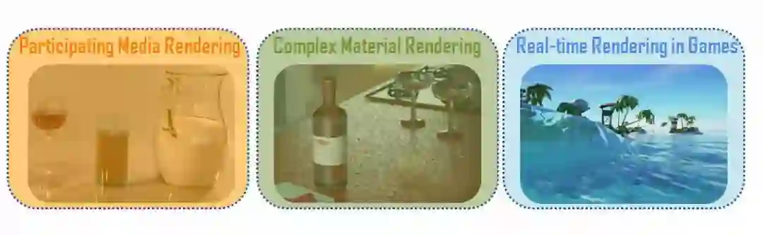 参与介质图形渲染,按照依据理论划分为:基于辐射传递方程和基于扩散理论,后者只能计算低平均自由程并且高散射反照率的材质,前者没有该限制。按照渲染效率来分,分为离线算法和实时算法,前者主要应用于动画等高质量渲染,而后者则对渲染效率要求较高。