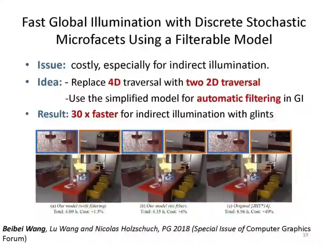 [4] Beibei Wang*, Lu Wang, Nicolas Holzschuch. Fast Global Illumination with Discrete Stochastic Microfacets Using a Filterable Model. Computer Graphics Forum (Proceedings of PG 2018), 2018, 37 (7), pp.55-64.