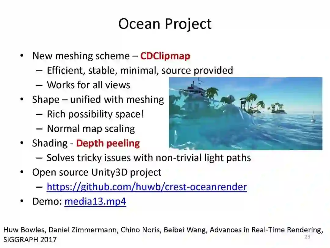 [8] Huw Bowles, Daniel Zimmermann, Gioacchino Noris, Beibei Wang. Crest: Novel Ocean Rendering Techniques in an Open Source Framework. Siggraph 2017 Advances in Real-Time Rendering in Games, Jul 2017, Los angeles, United States.