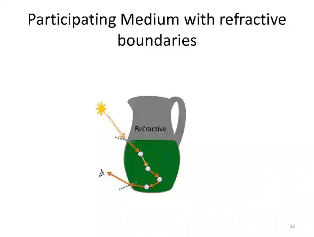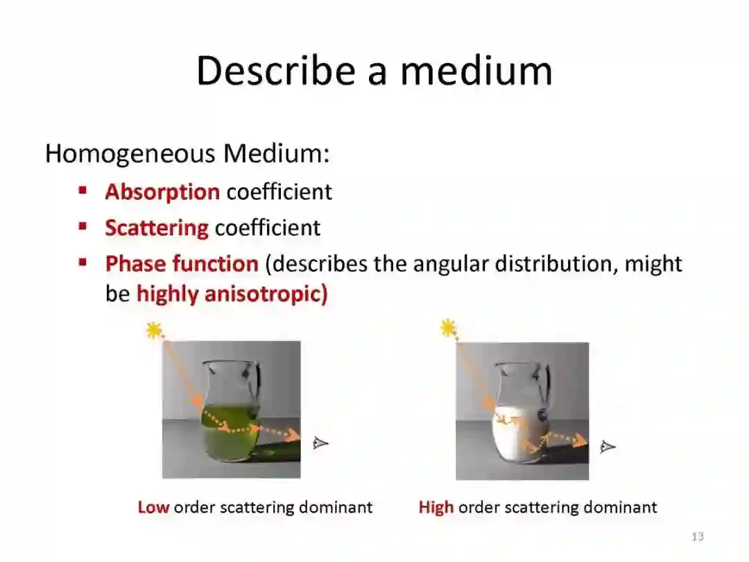 在表面渲染中,光线只在物体表面发生改变;而在参与介质中,则会被吸收或者散射,从而改变原始的传播方向,引起传播方向光能的增强或衰减。光线在参与介质中吸收和散射的强度,可以用吸收系数和散射系数来表示,前者描述了空间中每单位长度中光子被吸收的概率,后者则描述了每单位长度中光子被散射的概率。当散射发生时,散射到每个方向的概率用相位函数来表示,大体可以分为前向散射和后向散射。吸收系数和散射系数之和称为衰减系数,代表了单位距离内光子出射到其他方向或者被吸收掉的总概率。