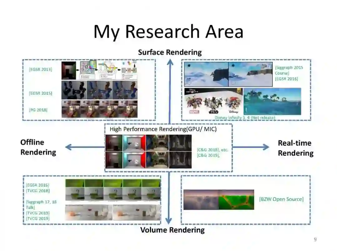 主要研究方向是计算机图形学绘制,包括全局光照算法、参与性介质光线传递和复杂材质模型等。