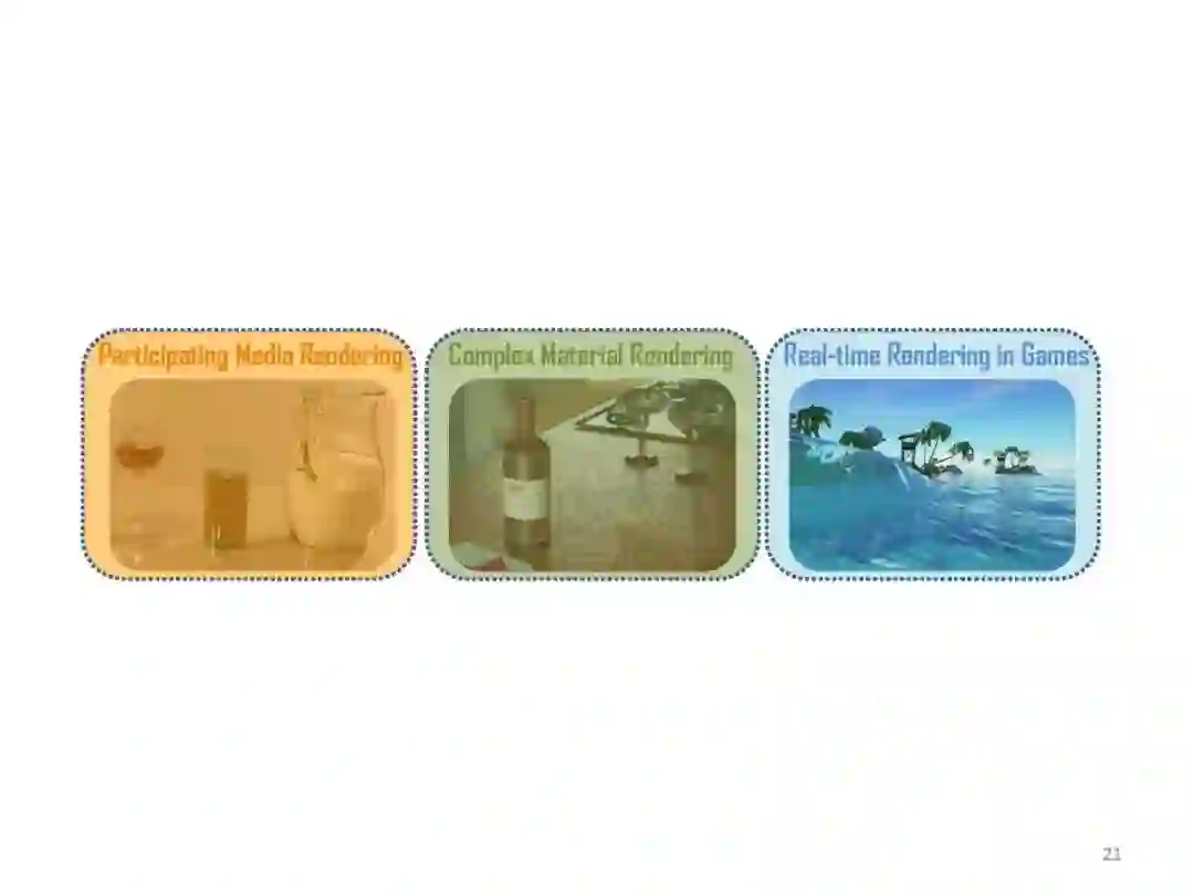 目前参与介质可交互或者实时渲染算法只能支持某种特定类型的参与介质:高平均自由程或者低平均自由程,或者假设参与介质没有边界。由于计算资源限制,此外,模型假设简单,往往导致渲染精度较低,在线渲染的实时性问题突出。