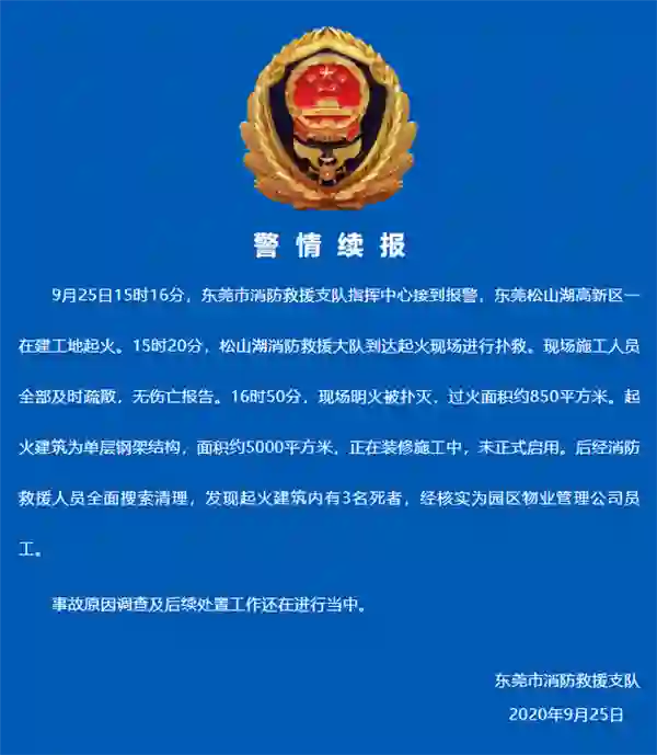 下午 17 点左右,东莞消防部门发布警情通报:“2020 年 9 月 25 日 15 时 16 分,东莞市消防救援支队指挥中心接到报警:位于东莞市松山湖阿里山路一建筑发生火灾。指挥中心立即调派松山湖及周边消防力量赶赴现场救援。目前火灾正在扑救中。起火建筑为钢结构建筑,主要燃烧物质为吸音棉。火灾暂无人员伤亡。”
