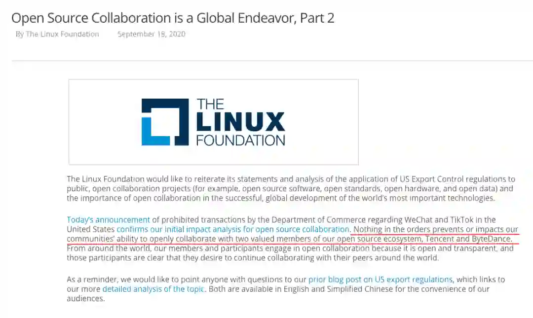 近日,因为 TikTok 最近在其官网发布了一项“开源软件声明”,让部分人开始担心美国政府的禁令会对开源领域带来负面影响。对此,Linux 基金会 9 月 18 日在官网发布博文回应,称:“禁令中的任何内容都不会阻止或影响我们与开源生态系统中两个重要成员——腾讯和字节跳动进行开放协作的能力。”
