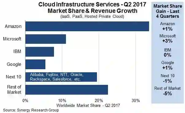 在微软与 Alphabet(即谷歌母公司)之间的这场云计算 / 深度学习对决当中,胜利女神似乎更偏向于前者。目前,微软已经成为仅次于 Amazon 旗下 AWS 的第二大云 IaaS(基础设施即服务)供应商。另外,微软公司亦在企业级 SaaS(软件即服务)领域扮演着当之无愧的领导者角色。