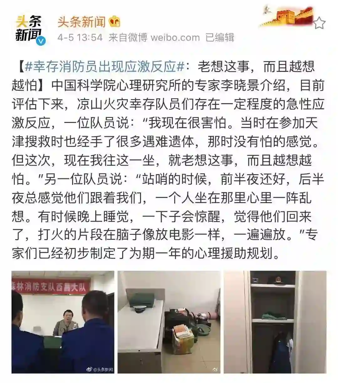 ——凉山火灾幸存消防员出现应激反应。