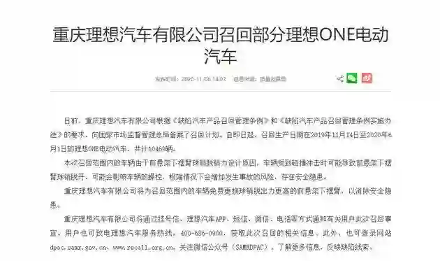 据国家市场监督管理总局显示,日前,重庆理想汽车有限公司根据《缺陷汽车产品召回管理条例》和《缺陷汽车产品召回管理条例实施办法》的要求,向国家市场监督管理总局备案了召回计划。自即日起,召回生产日期在 2019 年 11 月 14 日至 2020 年 6 月 1 日的理想 ONE 电动汽车,共计 10469 辆。