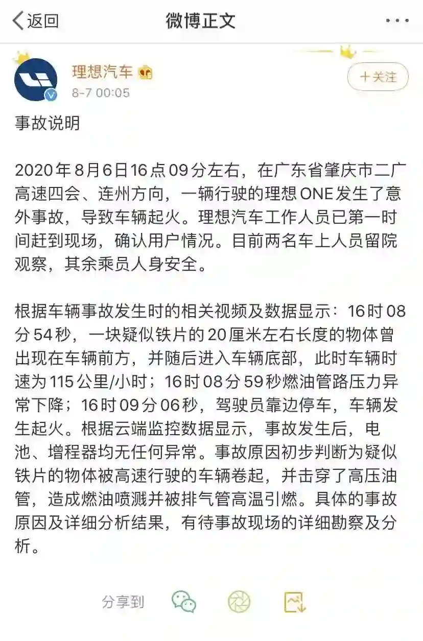 36氪获悉,今日,理想汽车在官方微博就近日的一起车辆起火事件发布事故说明。事故原因初步判断为疑似铁片的物体被高速行驶的车辆卷起,并击穿了高压油管,造成燃油喷溅并被排气管高温引燃。具体的事故原因及详细分析结果,有待事故现场的详细勘察及分析。