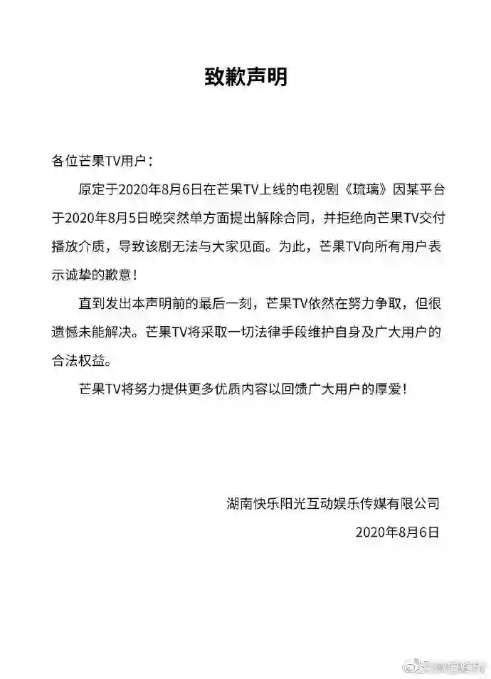 36氪获悉,芒果超媒旗下视频平台芒果TV昨日通过官方微博发布致歉声明。芒果TV称,原定于2020年8月6日在芒果TV上线的电视剧《琉璃》因某平台于2020年8月5日晚突然单方面提出解除合同,并拒绝向芒果TV交付播放介质,导致该剧无法与大家见面。