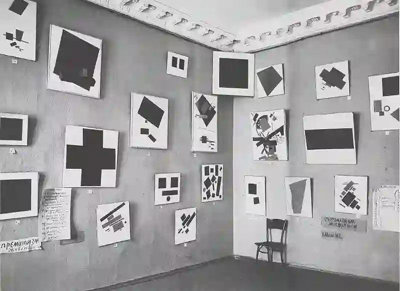 ▲ 马列维奇,至上主义作品的第一次展出现场,1915年