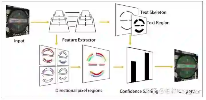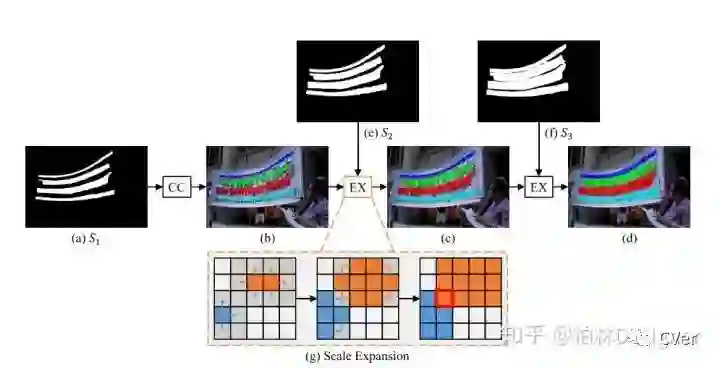 个人观点:这个文章其实做的只是一件事情,就是用预测得到的小的mask区分文本,然后逐渐扩张形成正常大小的文本mask,个人最近发了一篇比较水的会议论文也是检测不规则文本的:TextCohesion: Detecting Text for ArbitraryShapes,其实本质是和这个文章是差不多的(我发之前还没看过这个文章,好像也没有被收录),不过算法主体是不一样的,我这个文章过几天也会挂到arxiv上,主要也是用小的mask区分文本实例,但是我不是进行扩展,我是讲除了文本骨架外的文本像素给不同的方向预测,使得四周的文本像素对文本骨架有一个类似于“聚心力”的作用,最终形成一个文本实例。pipeline如下(在total和ctw1500上实验指标蛮高,暂时第一)