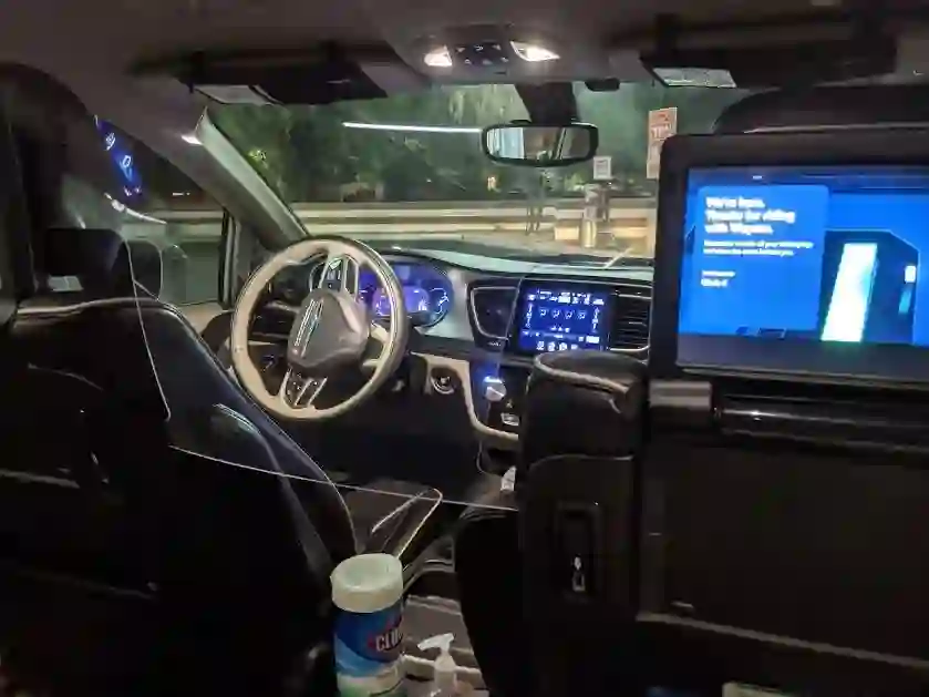 进入车内就能看到Waymo为疫情期间运行做的准备,车辆的后排和前排中间增设了一块透明的板子将前后隔开(不过这块板子上下通透,看上去隔离的作用并不算大),Waymo还在杯托的位置放置了免洗手凝胶和消毒用具。