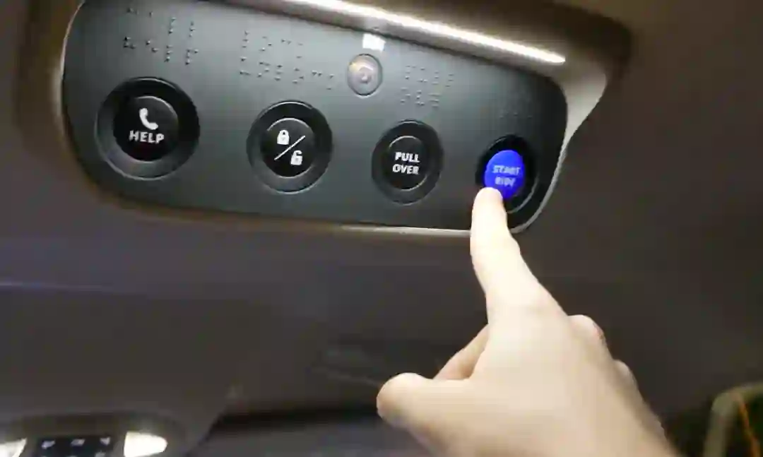 此外,车辆前后排中间的顶部还有四个按钮,从左到右依次是求助按钮、车门锁开关按钮、靠边停车按钮和启动按钮。比较人性化的一点是,四个按钮的上方均配备了盲文,也考虑到了视力不佳的用户。
