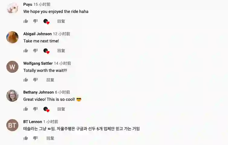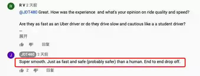 从视频上来看,车辆的转弯和加减速都比较流畅,没有卡顿的感觉,在整个行驶过程中,车速基本上都维持在30英里/小时(约合48公里/小时)以上。用户JDT480也在视频下方评论车辆的驾驶过程非常平顺,和有经验的人类驾驶员的驾驶非常相似。