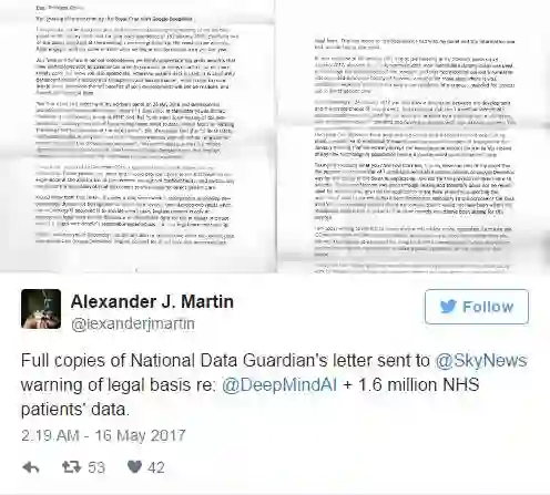 Sky News 周一获得并公开了由 NDG 寄给皇家自由NHS信托和 DeepMind 联合创始人 Mustafa Suleyman 的信件。一位 NDG 发言人证实了该信件的真实性。