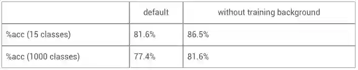 没有学习背景特征的模型在大多数训练中都保持领先,在没有训练背景的情况下,精确度在15个类别的数据集上都有了提升(9种狗狗类别、6种电器类别和其中的背景类别),同时在有1000种数据集分类上也有进步(9个狗狗类别、991种电器类别和其中一个背景类别):