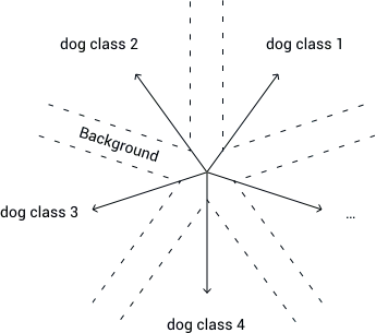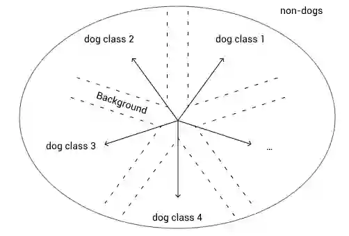 从我的经验来看,第二种方法表现不佳。我发现这样的模型学会了以狗狗为中心进行嵌入(logit层和softmax之前的最后一层),并且阈值通常会将各种类别的边界附近的嵌入映射到“背景”一类中: