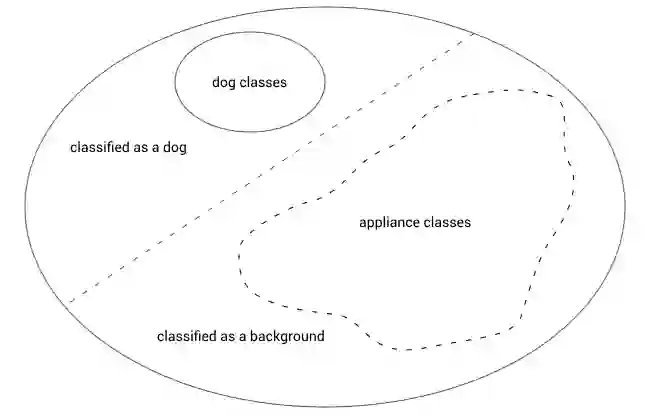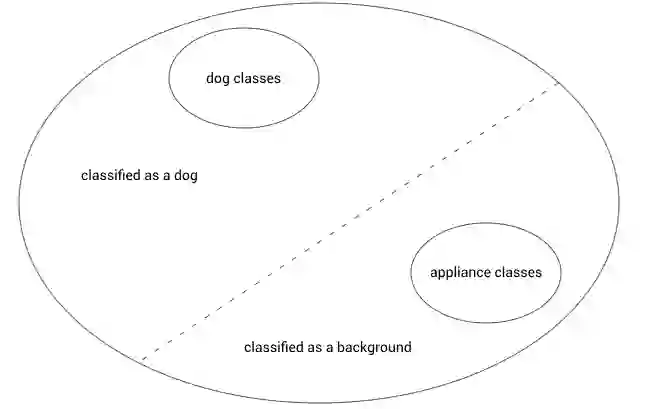 这样的分类器在没有狗狗的图像上可以任意工作。接下来,我们会介绍只能预测背景概率的分类器。