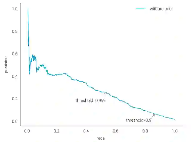 解决这一问题最简单的方法就是在每个肯定预测中加入更高的阈值,从而当概率超过这一值并且是最高的时,我们才能判断这是某种类型的狗狗。由此,我们得到了以下的精确度与反馈曲线,如果分类器从9种狗狗中预测出了一种,那么每个样本都都被看作是“正的”,如果预测结果为“背景”,那么就是“负的”。