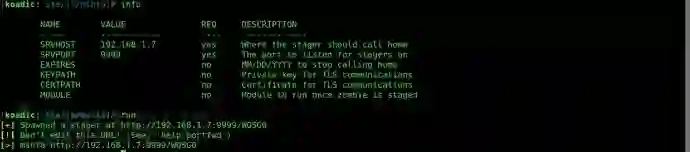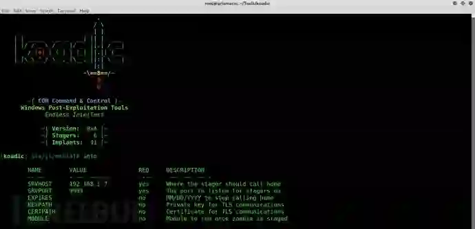 Koadic有几个内置模块,“stager/js/mshta”是首次执行该工具时的默认配置模块。你可以通过“info”命令来查看并配置模块。