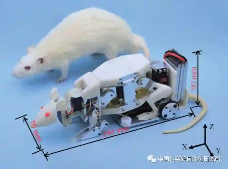 该仿生机器鼠平台与生物鼠体型相似,具有精密的传动结构,可模仿生物鼠的行为,进而可以与生物鼠互动达到研究生物鼠的社会学行为的目的。该仿生机器鼠具有15个自由度,同时加入视觉、红外等传感信息,可以进行自主学习、认知与决策等高级认知行为。