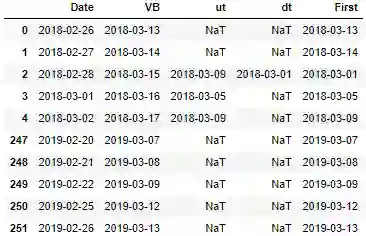 用 TBL 函数来确定三隔栏中的哪一个隔栏被突破了。下面代码第 3 行做的就是这件事,在 'VB', 'ut' 和 'dt' 栏下的日期中找出最小值(把 NaN 当做无限大),