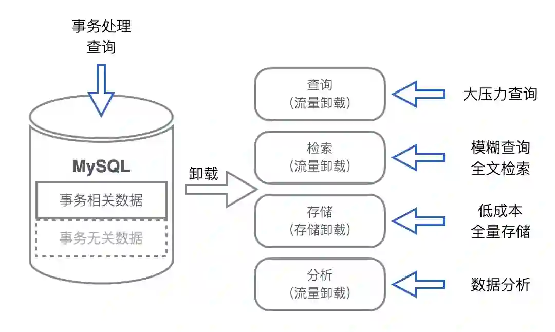 数据卸载:MySQL 内部分数据会用于事务处理,而部分数据仅存储和查询。不参与事务处理的数据可卸载,来降低表的存储量,对降成本和减负载都是有极大好处的。