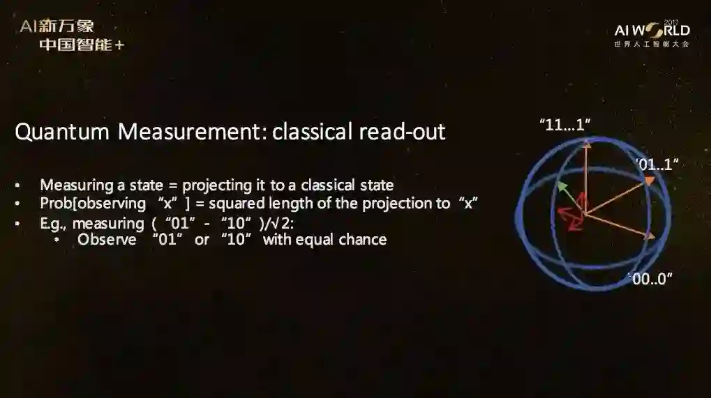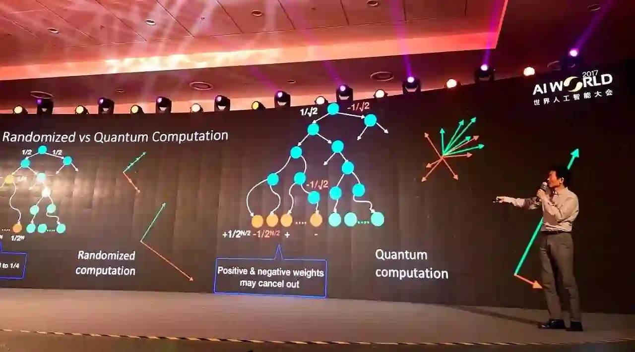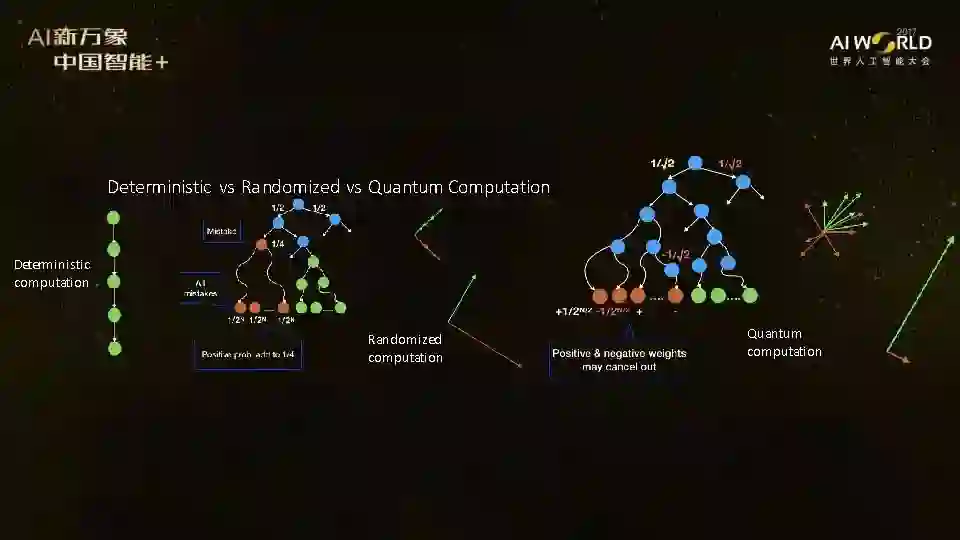 其次,量子信息处理目前还没有办法被经典的信息处理很快地模拟,这是一个未解决的问题——也许明天早上我起床后发现有一个人发明了迅速模拟量子计算的经典算法,那我马上改行做AI,这是有可能的。但是,我倾向于认为,而大部分科学家都不会认为量子计算能够被经典计算迅速地模拟。因为我们需要量子力学,有些现象无法用经典物理解释。