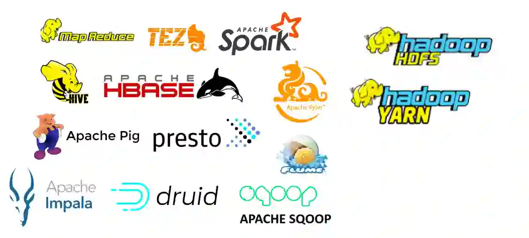 在这三个组件中,发展最迅速和多元的是计算组件这一层,最早只有一个 MapReduce,但业界很快在计算层上面各显神通,造出了一大堆的轮子,包括有 MapReduce,Tez,Spark 这样的计算框架,Hive 这类数据仓库,还有 Presto、Impala 查询引擎,各种各样的组件。配合这些组件的,还有像 scoop 这样的数据流转采集的组件也很丰富,一共有几十款。