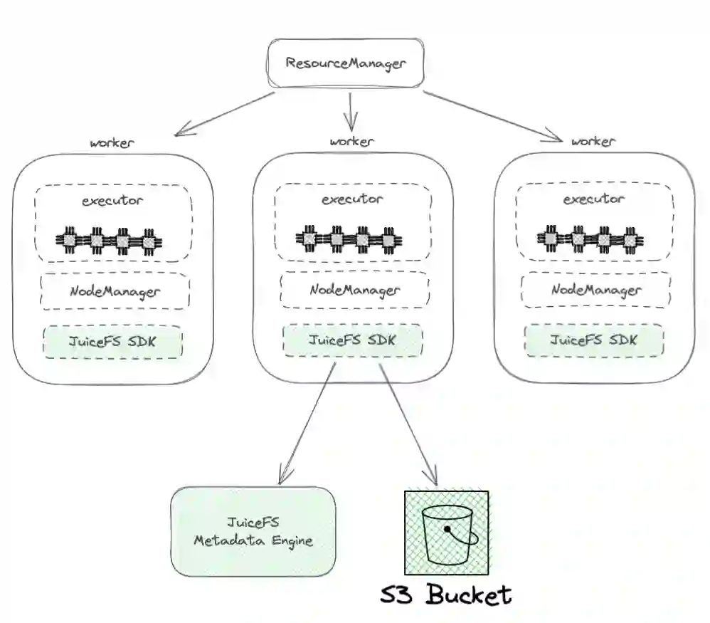 从下面这个简单的示意图看到, YARN 管理的这些执行节点上,都带一个 JuiceFS Hadoop SDK, 这个 SDK 可以保证完整兼容 HDFS。图片下方可以看到, SDK 它需要访问两个部分,左侧是 JuiceFS Meta Engine,右侧是 S3 bucket。Metadata engine 就相当于 HDFS 里的 NameNode,整个文件系统的元数据信息会存储在这里,元数据信息包括目录数、文件名,权限时间戳这些信息,并且相应的解决掉了 HDFS NameNode 扩展性 、GC 这些的痛点。