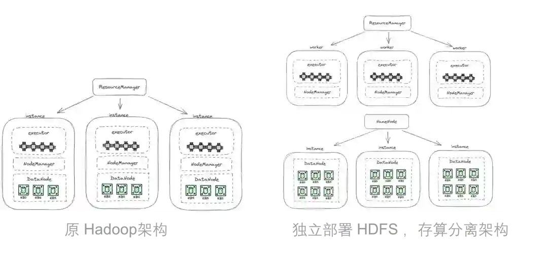从 2013、2014 年,行业内开始看到一些存算分离架构的尝试。最初的方案比较简单,就是独立部署 HDFS,不再和负责计算 worker 去混合部署。这个方案在 Hadoop 生态里,没有引入任何的新组件。