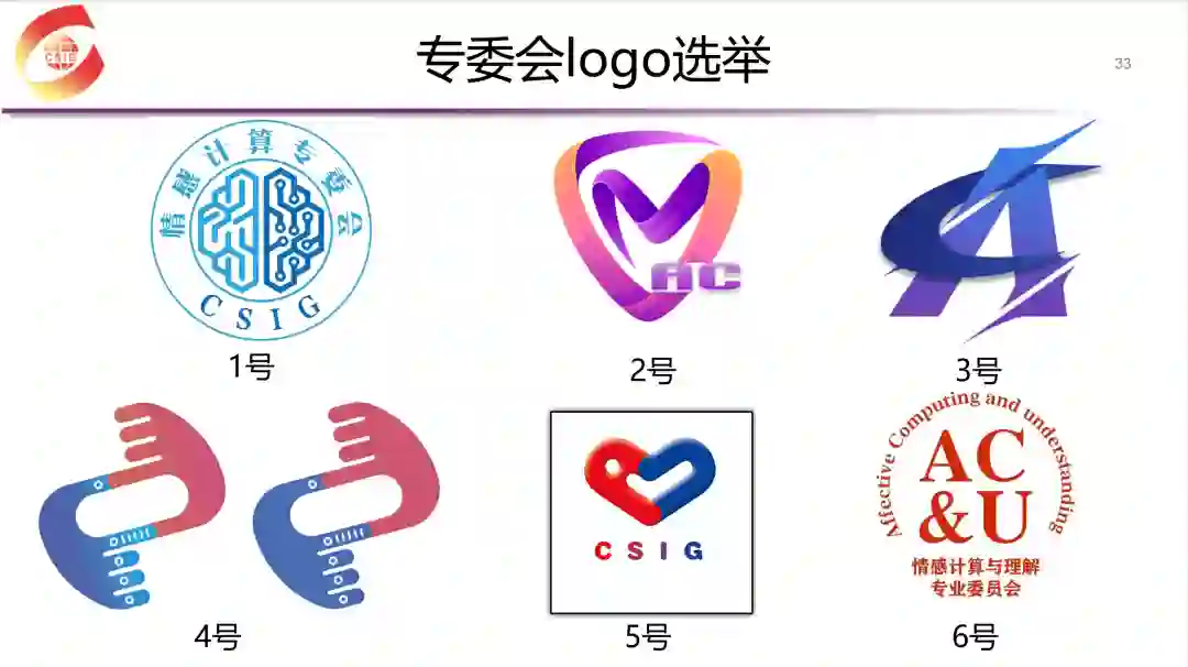为了更好地进行专委会宣传以及开展各项工作,专委会计划设计一个logo。每个logo设计者都介绍了各自的设计理念,从不同角度阐述了自己对情感计算与理解的独特理解。有的设计理念来自于古神话,有的突显专委会的首字母等。经无记名投票,2号和5号胜出,并将进一步在专委会常委会议上进行确定。