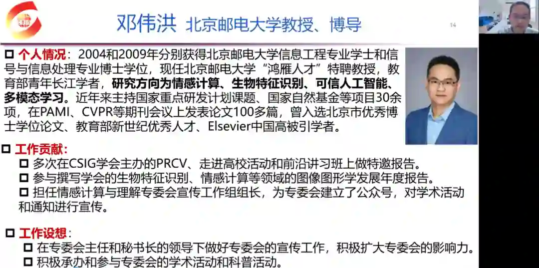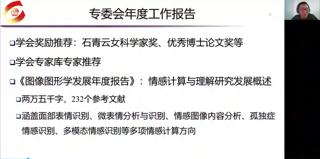 首先,由专委会秘书长赵思成博士作了专委会年度工作报告。赵秘书长全面回顾了专委会从今年5月31日正式成立至今举办的学术交流活动和完成的各项业绩,包括成立工作小组、撰写学科年度进展报告、推荐学会各项奖励和专家库专家、举办“情感认知,何去何从”学术论坛和云上微表情等各类学术活动等。赵秘书长对委员们积极承担各项任务表示了衷心感谢。