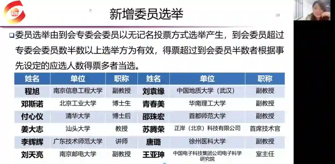 随后,专委会主任姚鸿勋教授主持了专委会常务委员选举、新增委员选举和专委会logo投票及意见汇总。专委会在选举前进行了充分动员和广泛宣传,本次选举共收到14位委员参选常委委员,12位委员候选以及6个logo候选。常委委员选举是本次会议的一个重点内容,为便于大家深入了解,每位常委候选人进行了一分钟左右的介绍,包括个人基本情况、对学会和专委会的贡献以及当选后的工作设想等。经无记名在线投票,邓伟洪教授、高跃副教授、洪晓鹏教授、金琴教授、李雷达教授、山世光研究员、王甦菁副研究员、王韬研究员、杨巨峰教授和郑文明教授等10位情感计算与理解领域的专家当选专委会第一届常委。加上专委会主任姚鸿勋教授、副主任薛向阳教授、梅涛博士、贾珈副教授和秘书长赵思成博士,第一届常委一共15人。来自不同高校和企业的12位新增委员候选人也进行了简短的自我介绍。经无记名在线投票,所有候选人成功当选专委会委员。