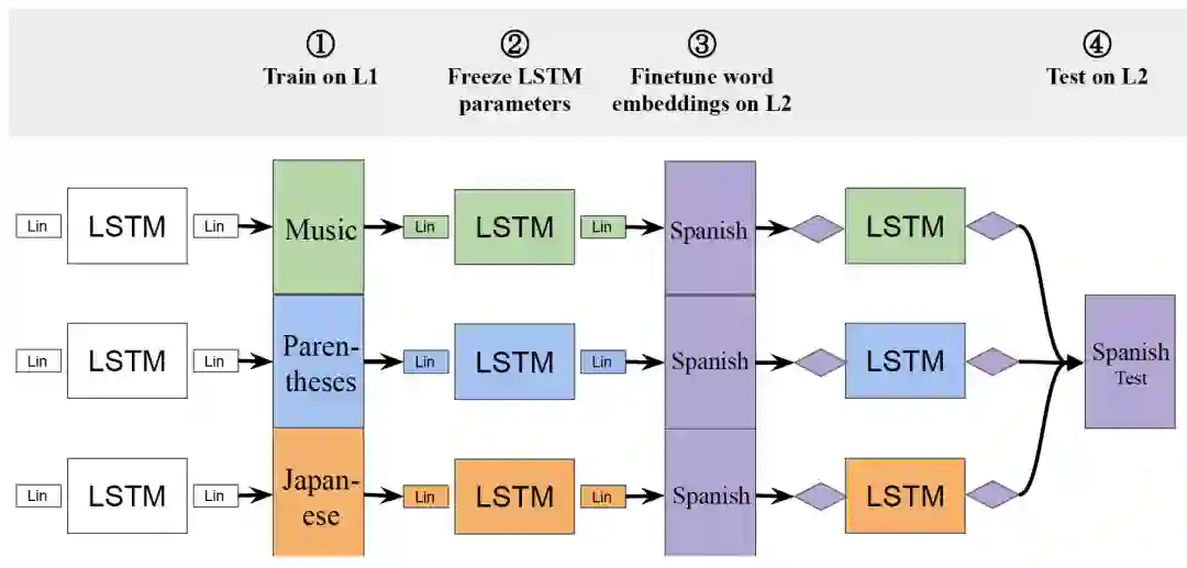 Q2: 为什么②中LSTM的参数是固定的呢?A2: 这是为了保留使用不同L1训练时所捕捉的潜在结构呀~固定LSTM的参数可以防止L2的自身结构信息被编码。因为最终是在同一个L2上进行测试的,所以可以公平比较使用不同L1进行预训练对L2测试结果的影响啦。文中一个核心的观点是将不同L1中的潜在结构当成inductive bias, 并探究其是否可以被语言模型捕捉并迁移到L2上。