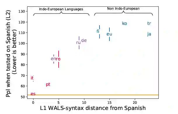 第四组实验使用不同的自然语言数据进行预训练,可以看到他们的性能其实还是远远高于non-linguistic data的。(所以说,其实标题或多或少有些噱头啦,哈哈。) 同时也可以看到,日语、英语、葡萄牙语对于西语的帮助差别也是比较大的, 那这又是为什么呢?作者认为是句法结构类型的差异性所导致的。因此为了探究不同自然语言L1对L2的影响,作者使用句法特征,将每种语言转化为句法特征向量,从而计算各个语言之间的WALS-syntax distance,即下图中的横轴。然后对比用不同语言预训练后在西语上测试得到的ppl,下图纵轴。图中可以明显看到句法距离越相小的语言之间的句法结构迁移的效果更好。
